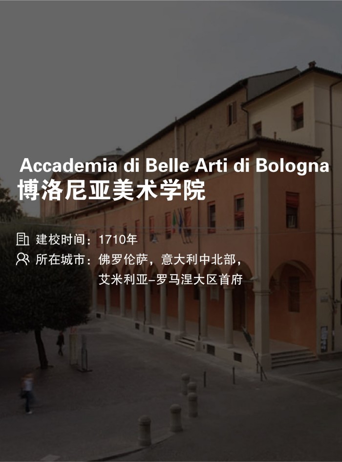 博洛尼亚美术学院(Accademia di Belle Arti di Bologna,简称博洛尼亚美院)的起源可追溯至 1580 年由博洛尼亚画派奠基人卡拉奇三兄弟创立的工作室,后于 1710 年重组为美术学院。学院坐落于意大利学者之城的博洛尼亚,位于历史悠久的耶稣会建筑群内,毗邻博洛尼亚国家美术馆,是意大利教育部直属管理的 25 所国立美院之一。