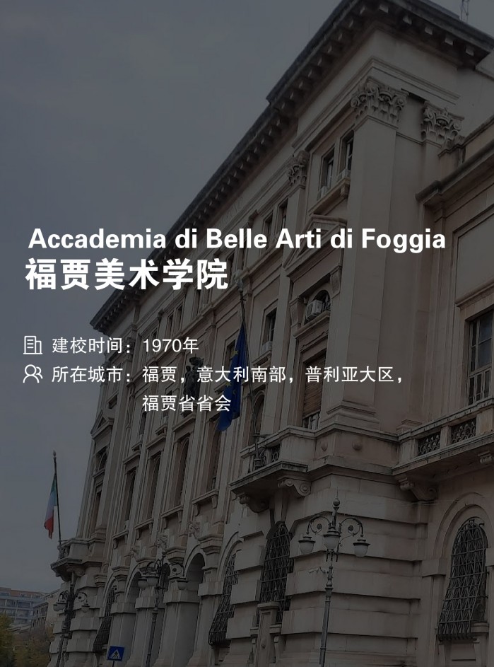 福贾美术学院(Accademia di Belle Arti di Foggia,简称福贾美院)成立于 1970 年,位于意大利南部普利亚大区福贾市中心,是意大利教育部直属管理的 25 所国立美院之一。