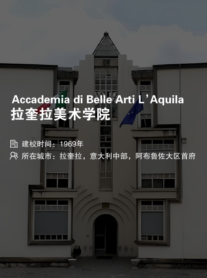 拉奎拉美术学院(Accademia di Belle Arti L’Aquila,简称拉奎拉美院)成立于 1969 年,位于意大利中部阿布鲁佐大区首府拉奎拉市,是意大利教育部直属管理的 25 所国立美院之一。